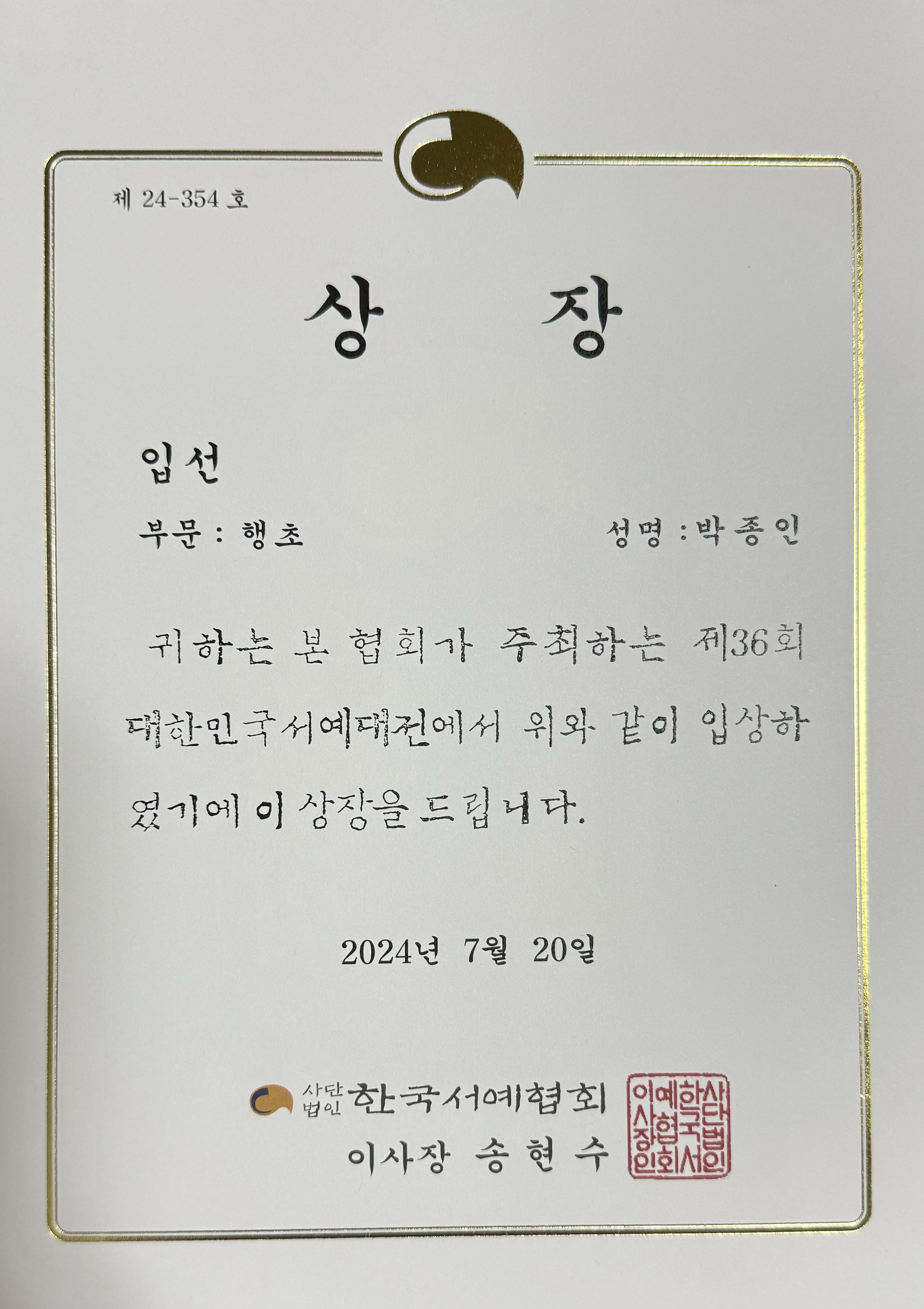 (24.07.20) 박종인 국장 사단법인 한국서예협회가 주최하는 제36회 대한민국서예대전에서 아래와 같은 작품으로 입선을 하셨습니다. 축하합니다.